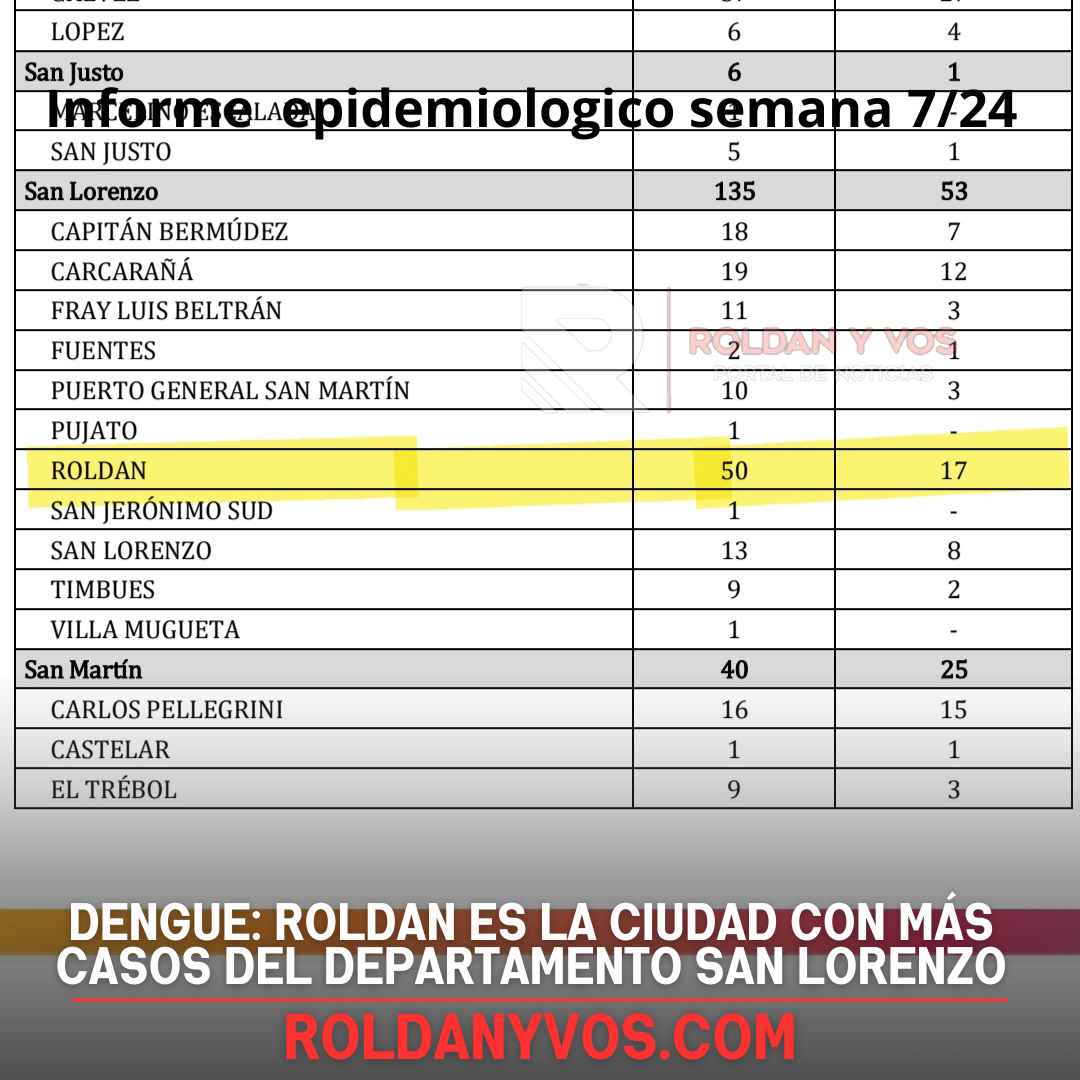 ✅️ Dengue: Roldán es la ciudad con más casos del Departamento San Lorenzo.