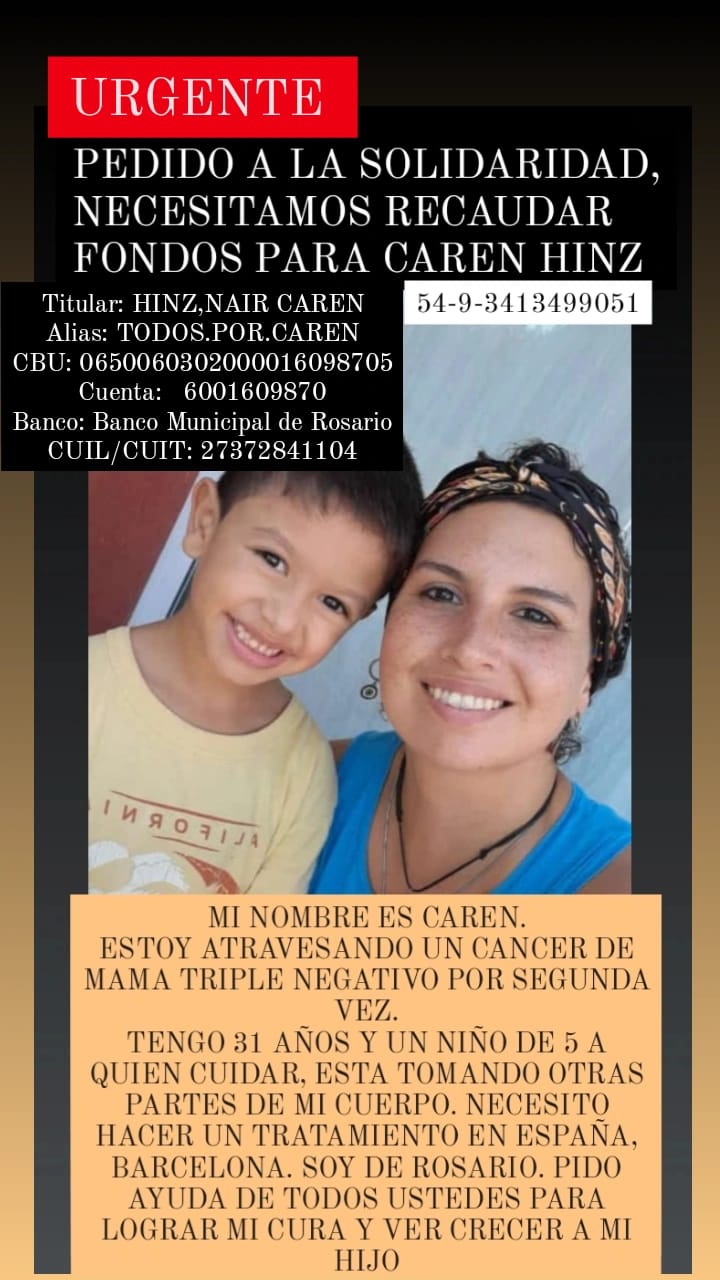 Con 33 años y un hijo de 5 años, está enfrentando esta batalla por segunda vez . Pero en esta oportunidad debe viajar a España es por eso que piden ayuda. Todos los aportes serán bienvenidos y la acercan un poquito más a la posibilidad de ver crecer a su pequeño. ¡Entrentodos es más fácil! .