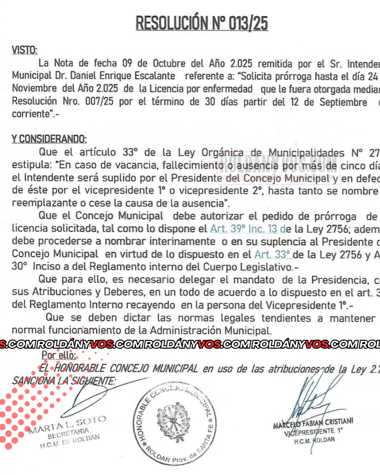 Según la Resolución N° 013/25, el cuerpo legislativo resolvió extender la licencia desde el 13 de octubre hasta el 12 de noviembre de 2025, en conformidad con lo establecido por el artículo 39 inciso 13 de la Ley Orgánica de Municipalidades N° 2756, que regula las ausencias prolongadas de los jefes comunales.