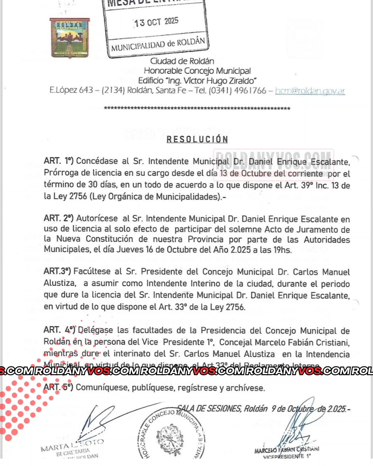 Además, mientras Alustiza ejerzja el Ejecutivo, las funciones de la Presidencia del Concejo quedarán a cargo del vicepresidente primero, concejal Marcelo Fabián Cristiani, quien firmó junto a la secretaria Marta L. Soto las resoluciones que oficializan la medida.