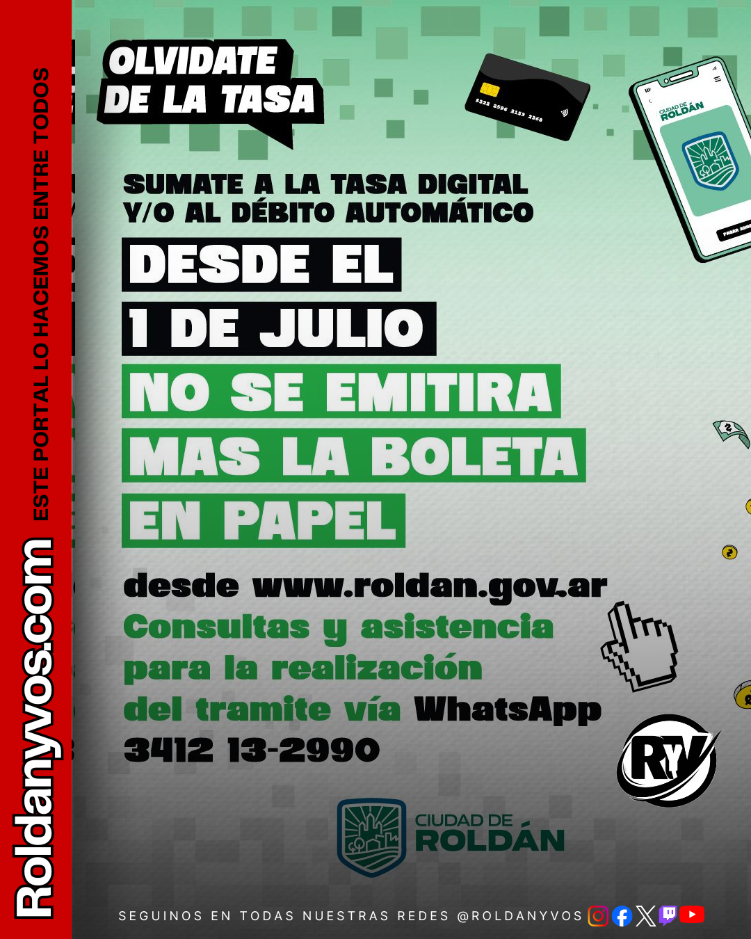 La Municipalidad de Roldán informó que desde el 1 de julio dejará de enviarse la tasa municipal en formato papel, en el marco de un proceso de digitalización que busca mayor agilidad y sustentabilidad.