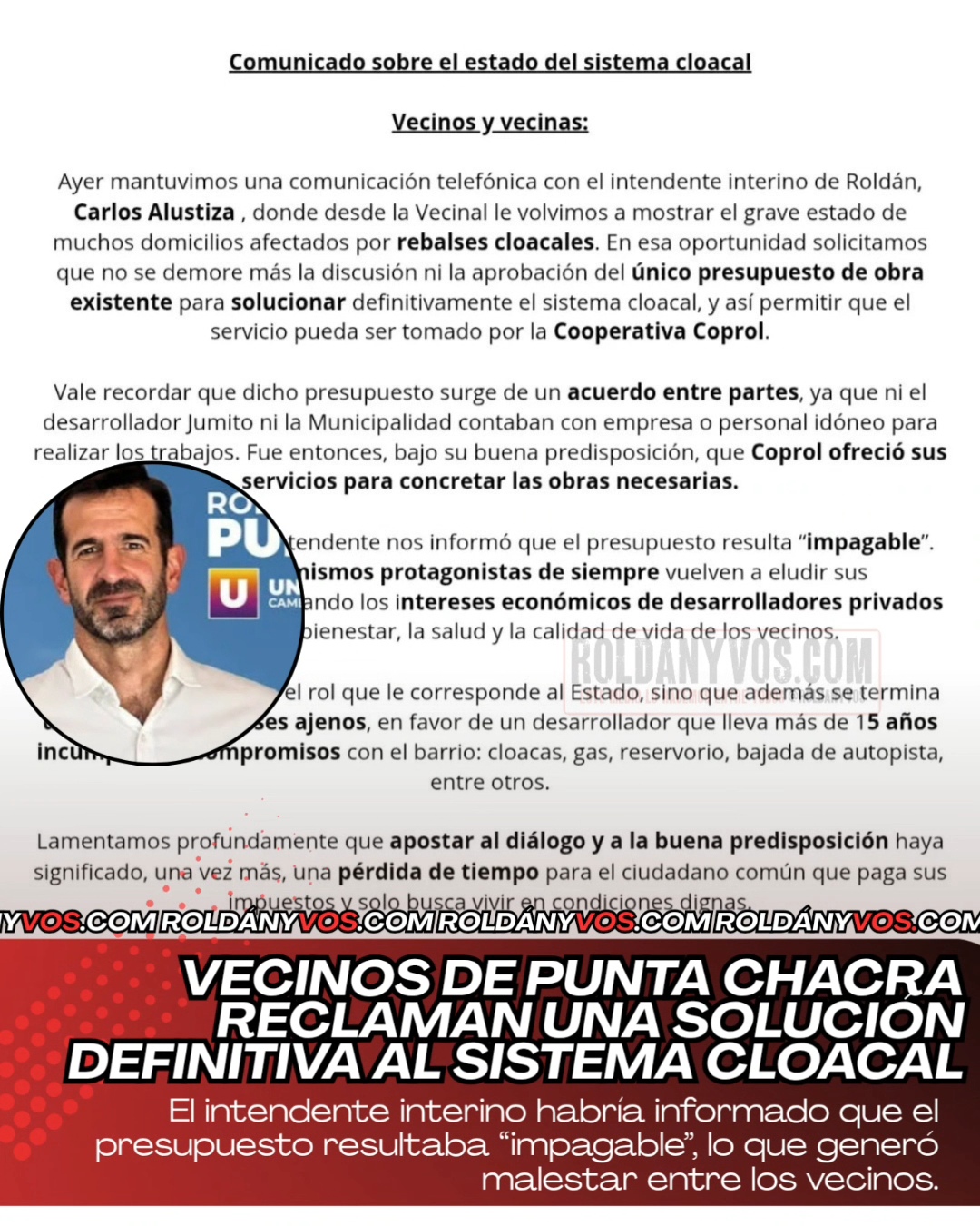La Asociación Vecinal Punta Chacra @vecinalpuntachacraroldan emitió un duro comunicado dirigido al intendente interino de Roldán, Carlos Alustiza @carlosmanuelalustiza tras mantener una comunicación telefónica en la que volvieron a exponer el grave estado del sistema cloacal en distintos domicilios del barrio.