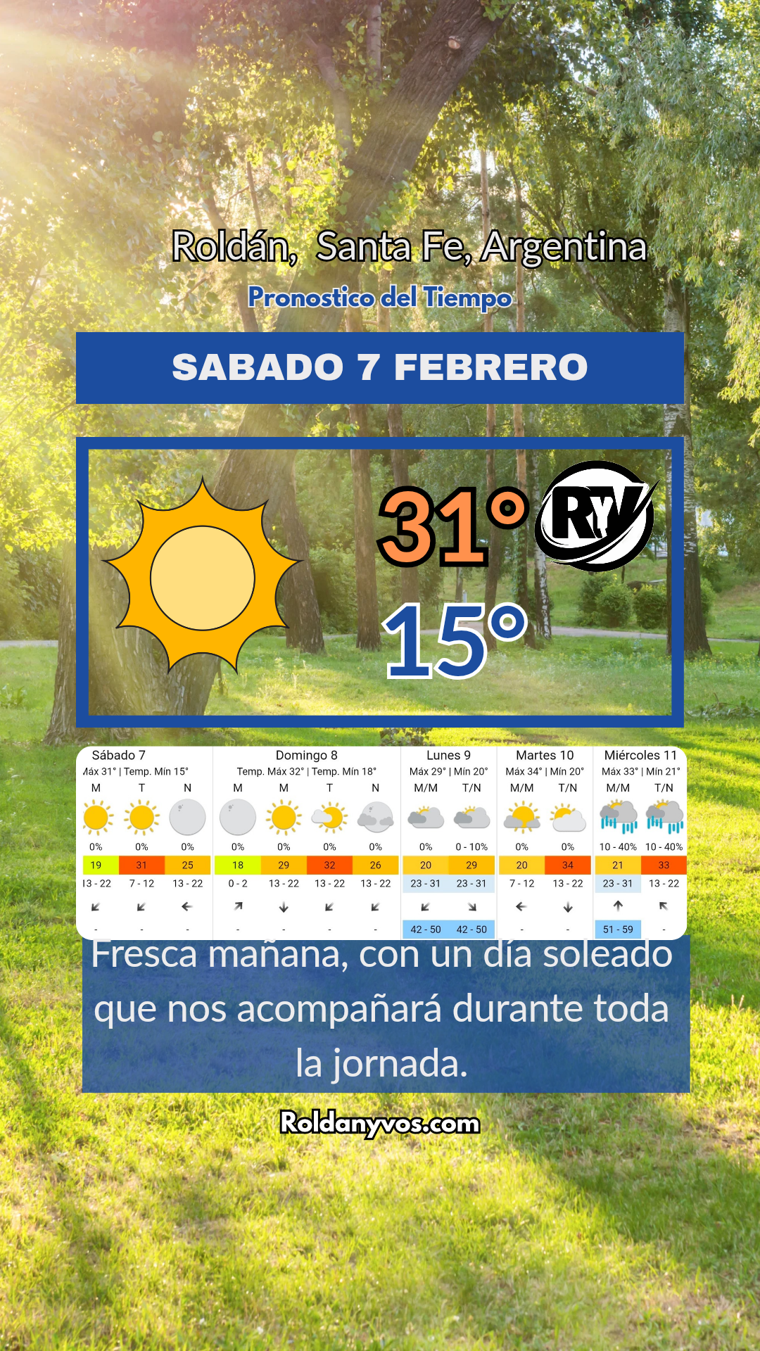 ▶️ Lo bueno durante poco dicen, por eso, este Sábado 7 de Febrero, según indica el @smn_argentina , tendremos una jornada de puro sol 🌞, la mínima fue de 15°, muy lindo y agradable, pero la máxima va a subir rápidamente hasta los 31°, algo que va a marcar una tendencia para el resto de los días por venir...