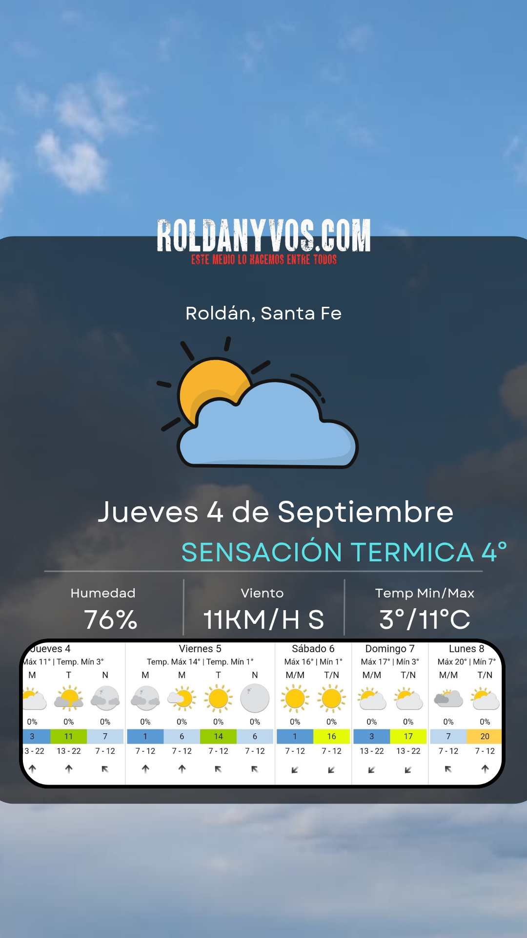 Este lunes 8 de septiembre amaneció fresco, con una sensación térmica de apenas 4°. La humedad se mantiene alta en 91%, mientras que el viento sopla suave desde el noreste a 4 km/h.